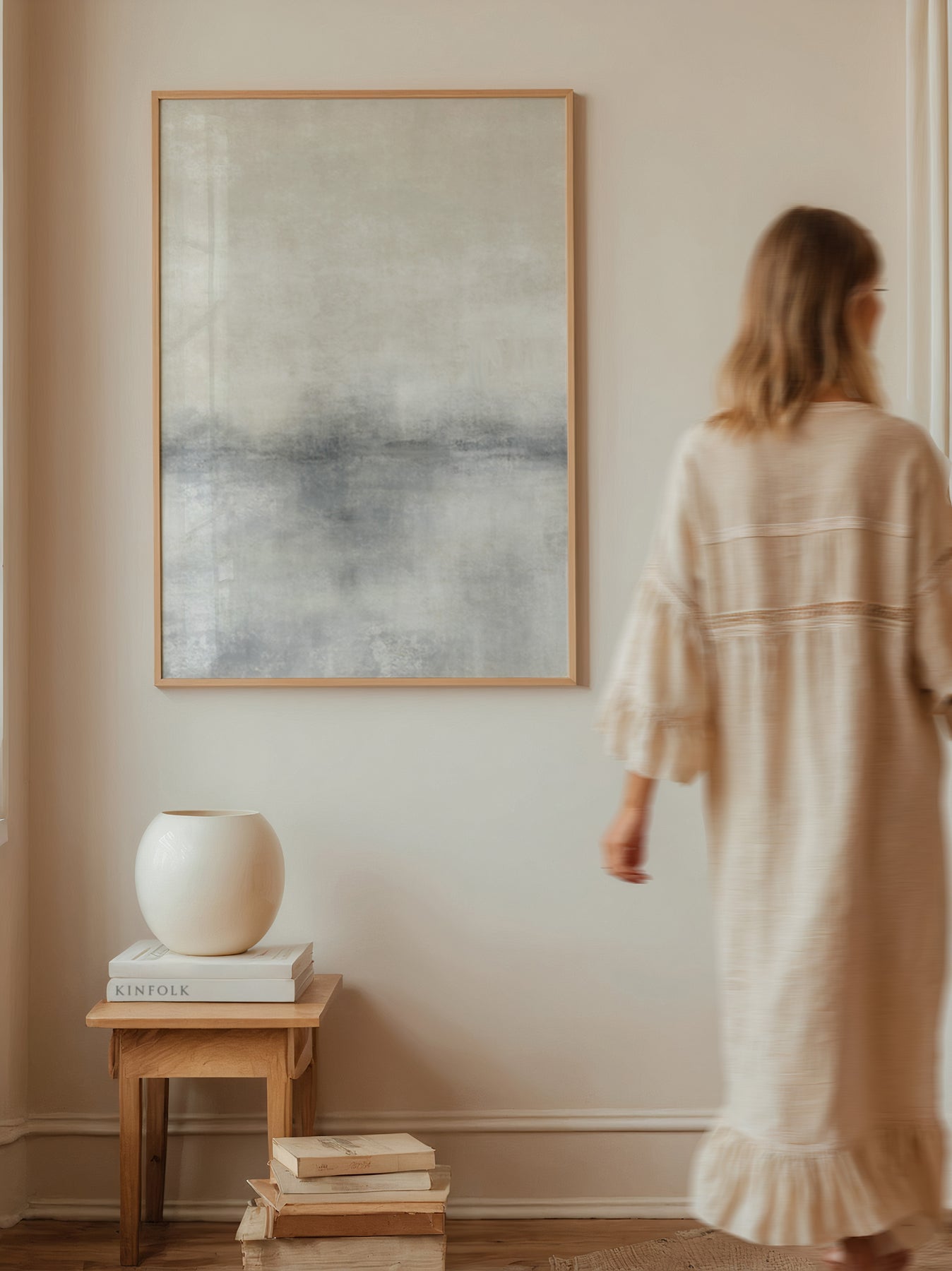 River is a flow of cream and washed grey tones in an abstract design wall art piece. Unframed wall print.