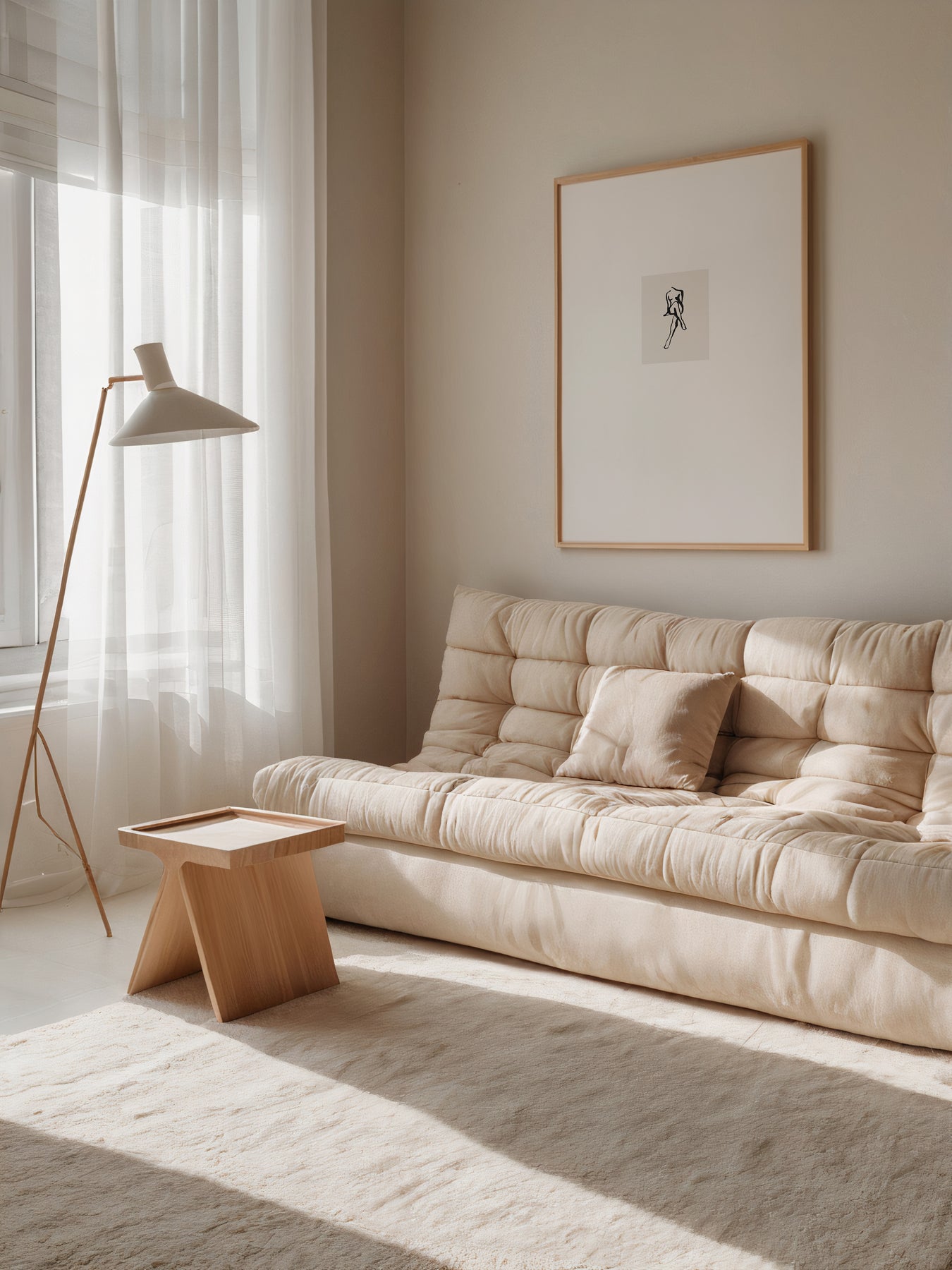 A modern abstract illustration of a female torso in black, against a beige background. The enlarged printed white border places the focus on the stunning abstract line illustration. Pair this print with Rue Part 2 and Rue Part 3.