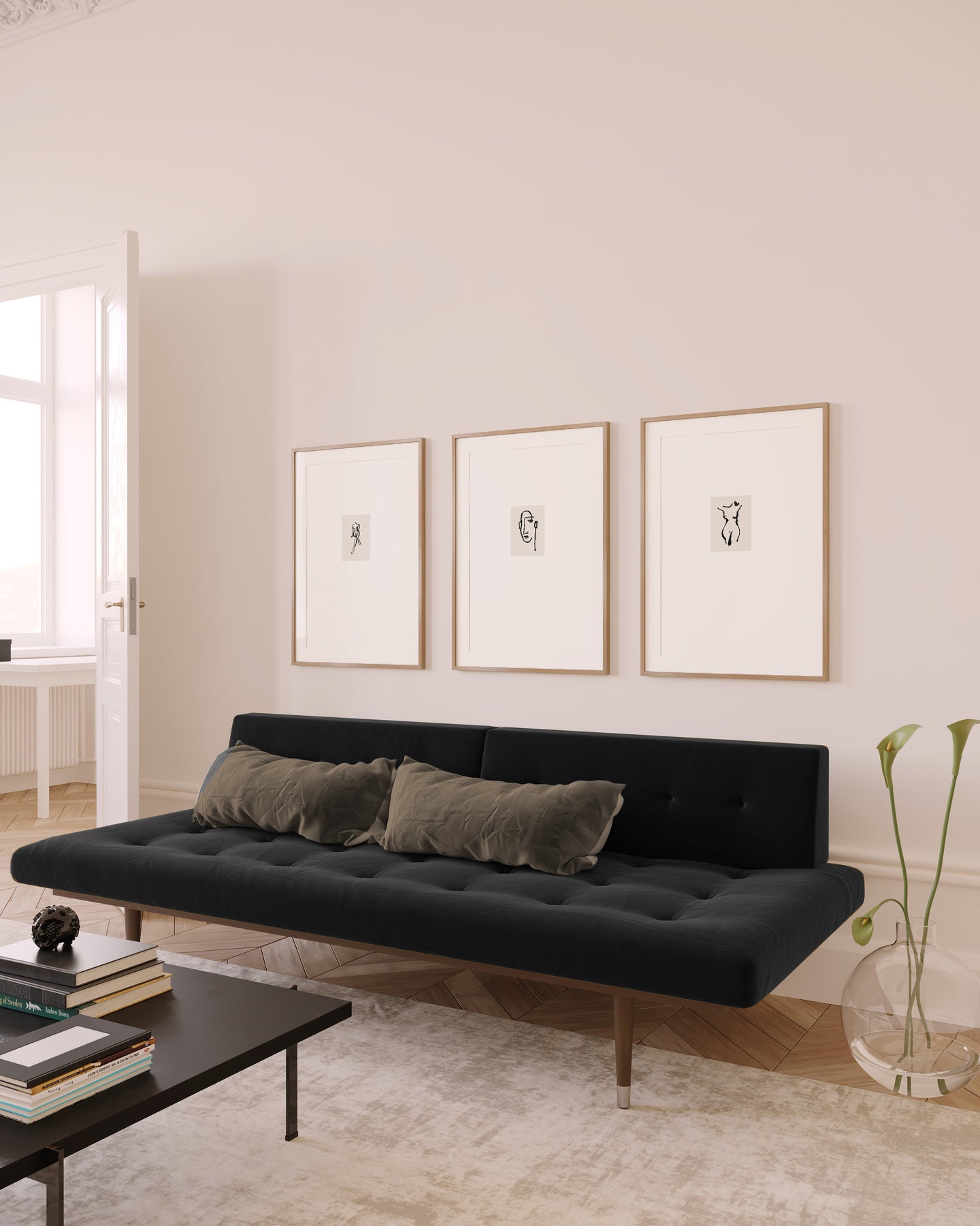 A modern abstract illustration of a female torso in black, against a beige background. Designed as part of a trio, pair with Rue and Rue Part 2 for the perfect modern trio - this print includes a wide white printed border as part of the design for a simplistic but elegant piece of art.