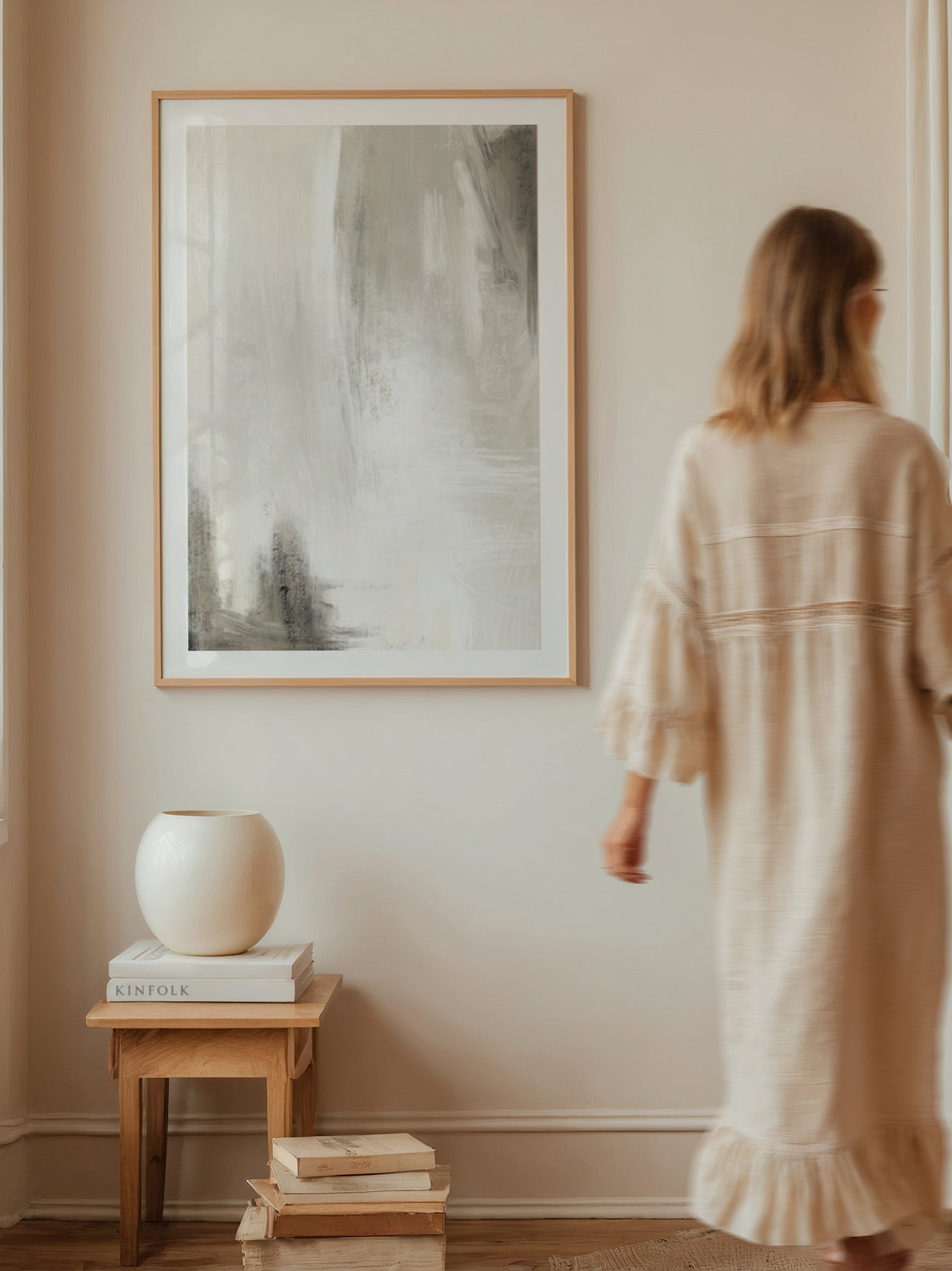 York part 2 is an abstract design in a soft dreamy layered brushstroke effect. A calming wall art print from the York collection. A neutral blend of greys , beiges, and whites.